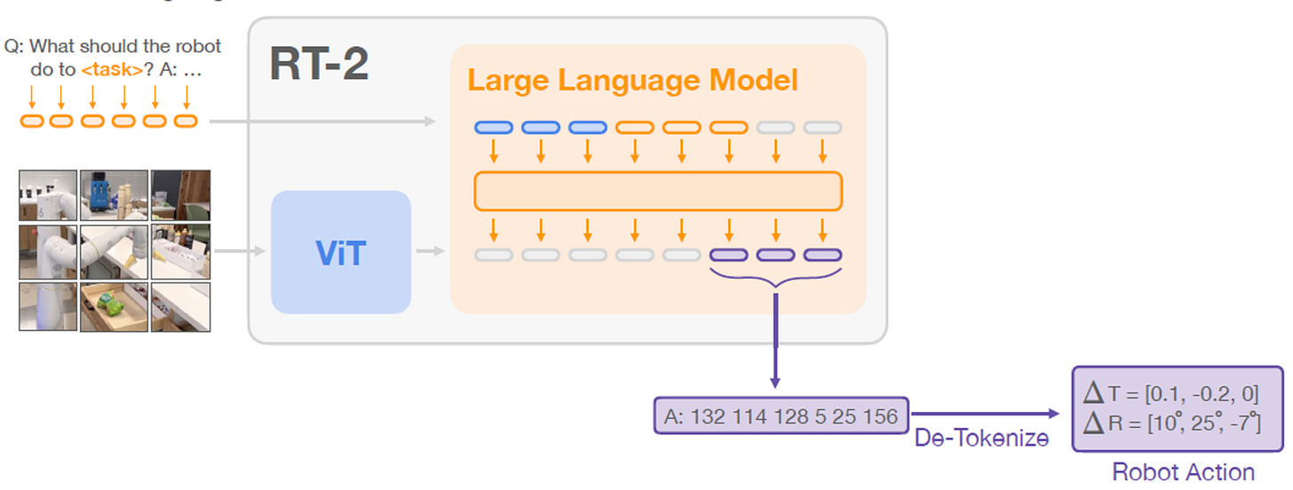 Another noteworthy breakthrough is the transformer-based robotic architecture RT-2 13 . It introduced a vision-language-action model, that encode robot actions as tokens to be processed by a transformer. The transform can generate such action tokens for the robot to take action accordingly. The architecture looks like this: