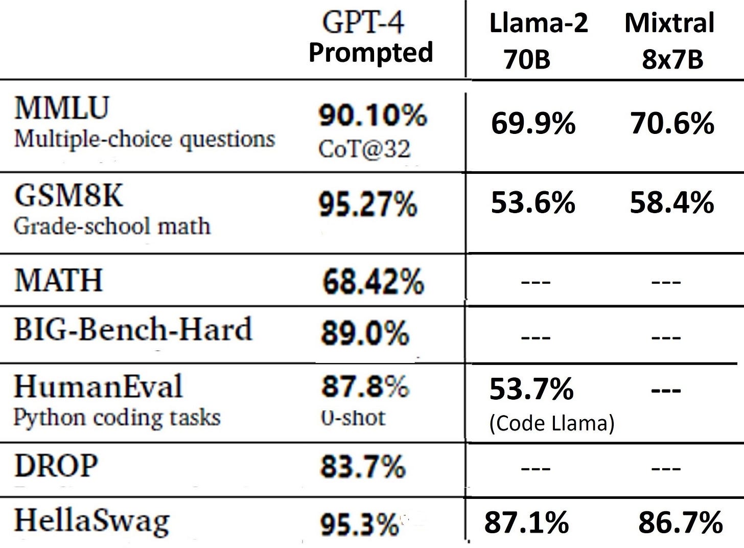 Meta's Llama 2 and Mistral's Mixtral 8x7B model are among the best-performing ones. They have generated excitement because they approached the GPT 3.5 level. But they are still far behind GPT-4. Here is the newest performance chart :