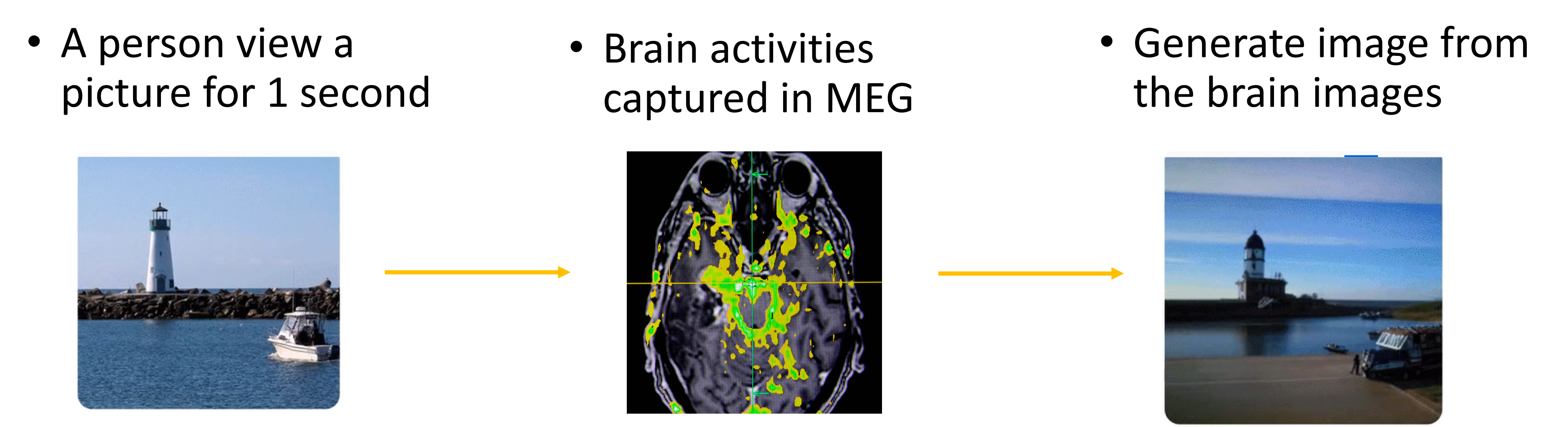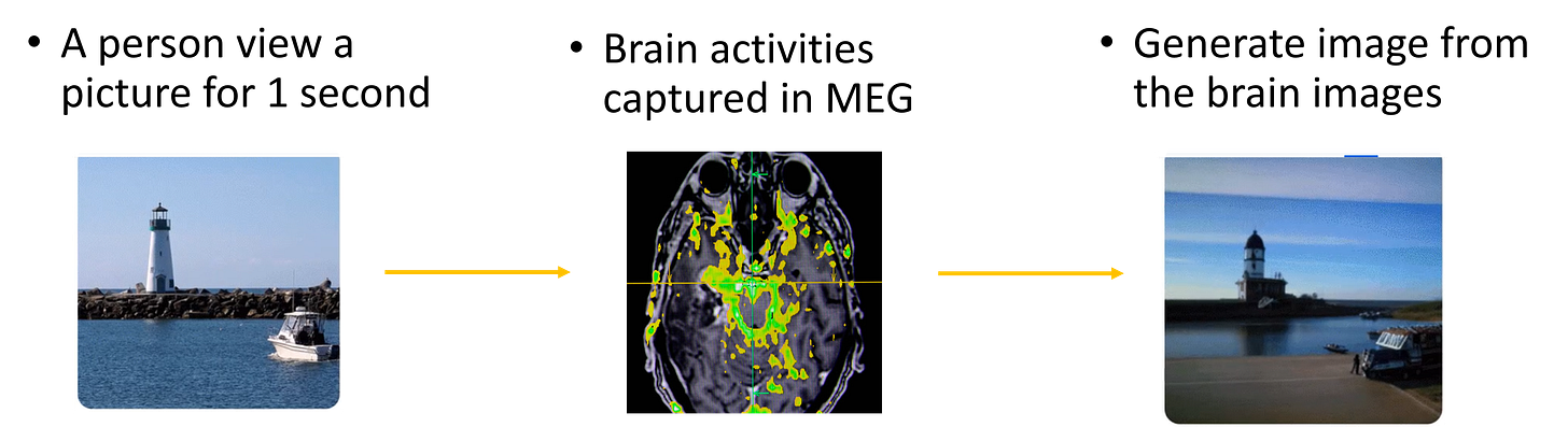 When we measure a person's brain signals, can we actually detect what the person is hearing or seeing? Another astounding achievement in 2023 involves real-time image reconstruction based on brain signals recorded by MEG.15 The level of accuracy it achieves is truly astonishing.