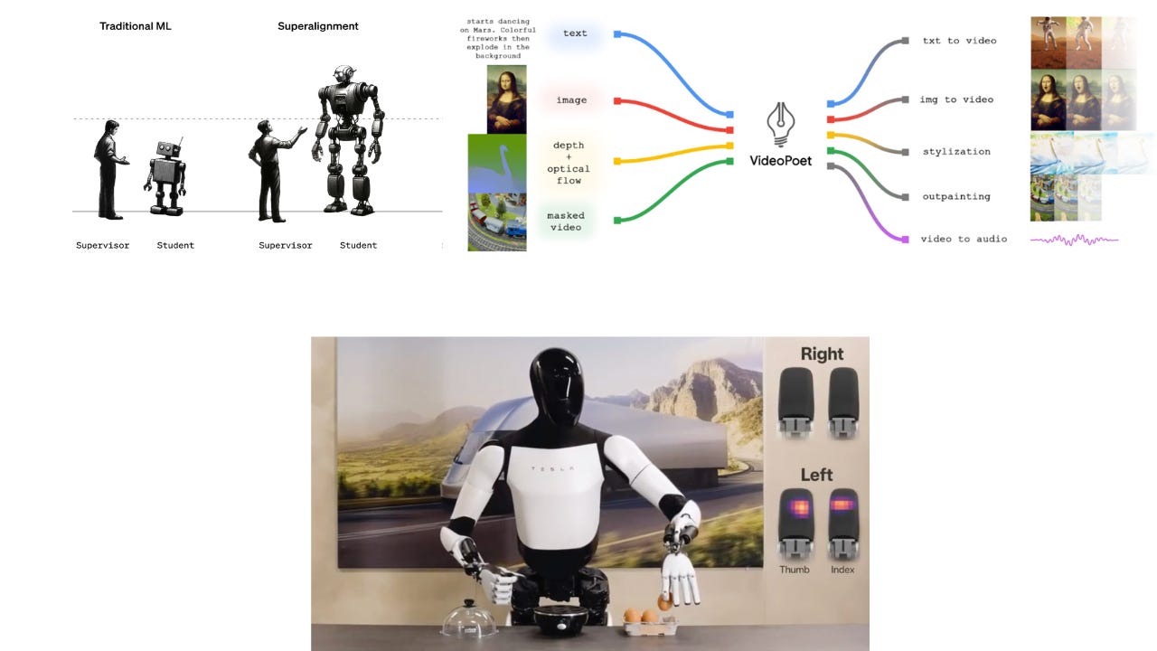 A third important development is investigating whether RLHF will continue to be useful in the future. There is an implicit assumption that RLHF will always improve a model's performance because humans know better. However, this assumption may not be true anymore. In the coming year (this or next year), we will observe AI growing into superhuman intelligence. This means it will beat humans in almost all tasks, from writing a good email to solving a math problem. When we force an LLM to conform to a human's way of writing or speaking, we could degrade the LLM’s performance in doing other tasks. In other words, training with RLHF could make an LLM less capable. This is very different from classical supervised training, where humans are always smarter. This situation is shown in the center picture of the following figure, where a person is trying to teach a superhuman AI.