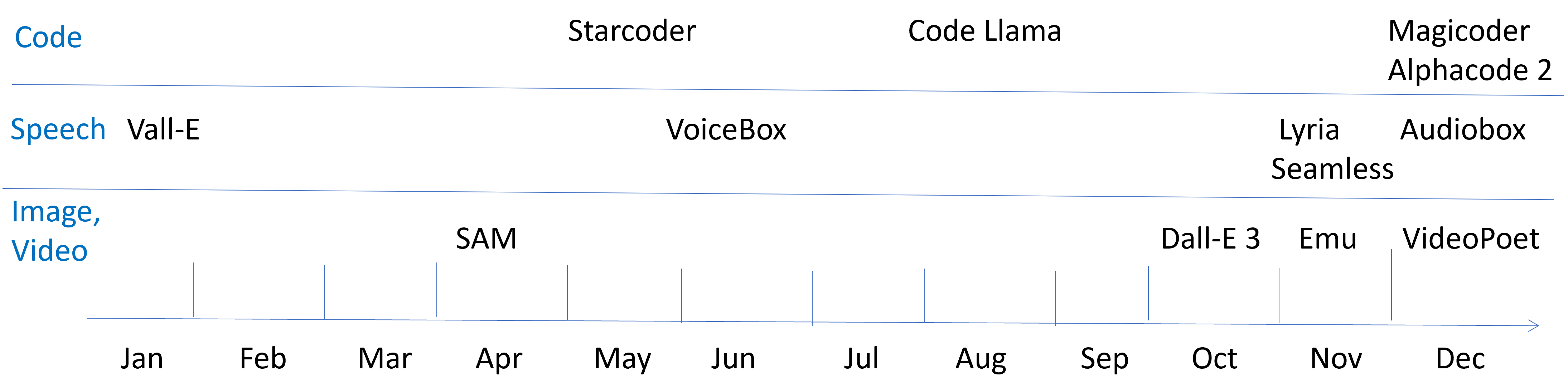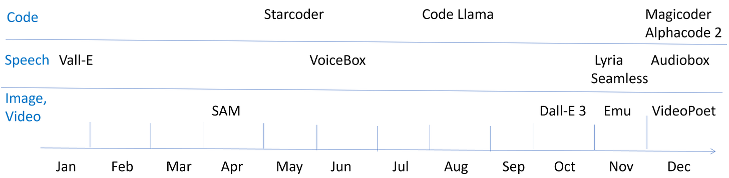 For image generation, Meta released the Segment Anything Model (SAM) in April, capable of zero-shot segmentation on any picture. In October, OpenAI released Dall-E 3. It has the best image generation quality with deep language understanding.