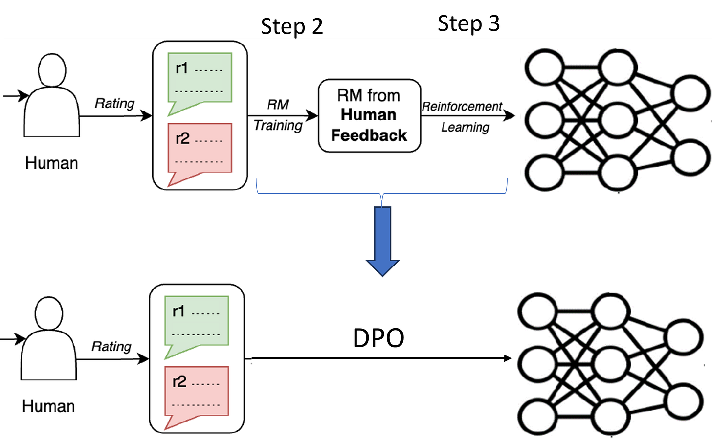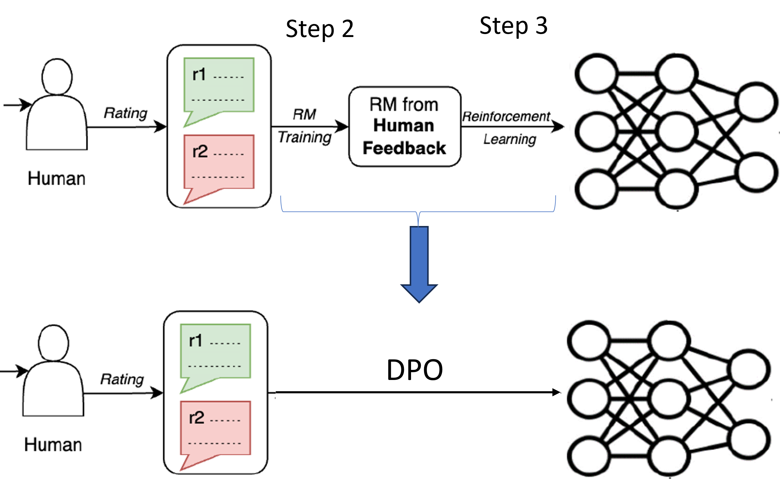 One improvement on RLHF is replacing the reinforcement learning step. Researchers from Stanford University proposed a method called DPO (Direct Preference Optimization) 10. Instead of training a reward model and then learning a reinforcement learning model, DPO simply uses the preference data directly to train the LLM. Therefore, DPO reduces two steps (reward function learning and RL) to one single step.